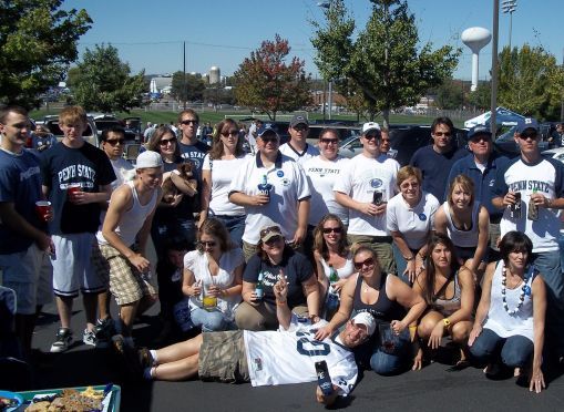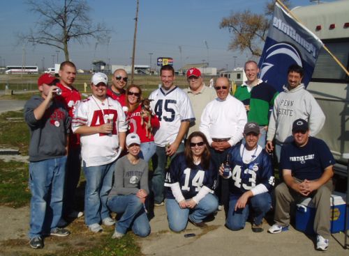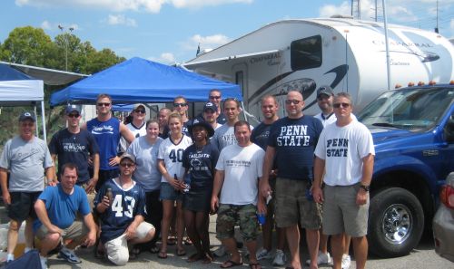 "It Burns the Tip"Thursday:The RV convoy met at Sam's club around 6:00 to start the convoy into the overnight parking lot. The crew was totally perplexed when they were presented with end row spots. They said earlier in the week "we don't need a site plan for the end row, because we'll never get an end row spot." Well, it was their lucky day. After setting up shop, they headed to the Darkhorse for Yuengs and Wings. They met some Budlight girls and then headed to College Pizza for their late night snack. On the way home, they of course stopped at the pigs. The night is never complete, until the pigs are ridden.Friday:We woke up to a beautiful warm day at the campers and Tim supplied the crew with breakfast. They caught the shuttle to the Family Clothesline to do some flair shopping. Jessie won most of the trivia questions on the way. We walked around downtown for a while and the guys swarmed on the football buttons at Citizens Bank like a pack of old ladies at the bargain bin. Once back at the campers, we grilled up some chicken. We finished in time to head down to Shortlidge to watch the parade. There was a pink cement mixer this year, but no Octocycle. After the parade, we headed to the Saloon to watch Velveeta. There was even a crazy jacket guys there.