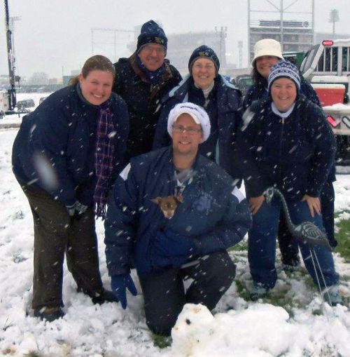 We arrived and Mad and Suz's tailgate for Bacon and toasty cinna-mini buns for breakfast! What could be better?!?! As always, the tailgate was decked out! Warm apple cider on the stove all day long, and the cooking area was nearly a full service kitchen! A neighboring tailgater stops to ask for cooking spray. The response was, "why of course! Would you like Pan, Olive oil, or butter?" Jen's favorite new favorite food...Steak and Cheese pierogies! Yummy! The 3:30 kickoff allowed us extra time to share goulash with the neighbors and enjoy THE BEST chocolate cake ever for Larry and Carol's wedding anniversary. Even thought it was Jen's Birhtday, she helped out by passing out food to the neighbors. Who knew we'd get to celebrate a birthday and an anniversary while drinking in the snow?!? The snow was coming down so hard all day that you couldn't see Mt. Nittany. We had to make something else to make the group photo interesting. I made a really bad snowman. Madeline, however, made a very good recreation of the Lion shrine with Olives for eyes. You can see it in the bottom of our group photo. Madeline and Suz also gave me a Halloween Flamingo to replace the kidnapped pink flamingo. This one was black with bones painted on the outside. It did look a little odd in the snow. Right before game time, a truck pulled and an seemingly drove of the Snow Lion. Little did we know that the Lion was safe and sound under the rear axle. Want to smuggle food into the game? Hide it under a giant poncho! Want to eat the food you smuggled into the game? Don't let it fall out in the bathroom! Want to stay warm during the game while sitting in the snow? Buy some hot cocoa and spike with some honey! Jen really enjoyed our section because of the Candyman!! "You've got to move it, move it...".