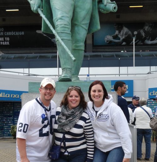 This was a huge bummer, because had we known, we could have easily driven to Dulles and caught our Dublin flight as planned. The ticket agent wasn't even that helpful. We picked up our car and headed back home to get everything else re-booked. The ticket agent said that the airline would waive change fees to extend our trip by a day, but this was easier said than done. Another hour on the phone and 2 agents later and we were re-booked. Aug 27 = leftOur second attempt to leave the U.S. went a bit better. We were able to get checked in and through security. YEAH! This time; however, our travel route would take us from PIT to IAD, IAD to JFK and JFK to Dublin. The 1st 2 hops were also via turboprop. Our 3rd flight was an Aer Lingus flight, with the big Shamrock on the tail. It was a long day of traveling, but everything worked fine.Aug 28 = arrived early and tiredWe arrived earlier than planned in Dublin at 4:40 in the morning. We were greeted in the airport by the Anthony travel staff with balloons and banners. We were able to quickly get a cab and get to our hotel. We arrived at ~5 AM. It was still dark out, so we caught a few winks in the hotel lounge. After the sun was up, we stored our luggage and headed out to explore. Our hotel was about a block away from the city center. We grabbed some breakfast at Kylemore on O'Connell St and then explored along the River Liffey.When we returned, our room was ready and we met Eugene, our hotel's Anthony Travel representative. We picked up our commemorative lanyards, some pins and some maps for the events. We had some minor troubles with our primary travel adapter. We I first plugged everything into the adapter and into the wall, the adapter was loose. It sparked and tripped the breaker for our room. Needless, to say it went in the trash and I switched to our backup. Everything was good after that. We caught some winks and headed out on the Dublin Bus hop on-hop off bus tour. During our travels around town, We saw the players heading into the library at Trinity College. A while later, we hopped off the bus tour to see the Blue Band play near St. Stephen's Green. I got my picture with the Nittany Lion. While there, we caught up with Jessi and her friend Jenny. We all headed to Dawson St. Lounge, the smallest bar in Dublin. It was 24 seats and down a spiral stair case. Unlike our favorite State College basement bars, this place was well ventilated, clean and carpeted. We had a few pints before heading further up Dawson Street to Café Au Siene for dinner. After a lovely dinner and a few drinks, we split company and headed back home. Aug 29 = Guinness partyFriday morning, we got off to a slow start, there was a brief fire alarm at about 7 AM that woke us up. We drifted back to sleep, only to wake up well after breakfast was over. Apparently, someone put a croissant in the toaster at the restaurant, which sets off the fire alarm for the whole hotel.It was cooler today and misty. We walked over to the old Jameson Distillery for a tour. We had to wait a few minutes before heading inside to book tour tickets for an hour later. During our wait, we checked out the gift shop and had lunch at a café in the square with Jameson. During our tour, I was lucky enough to be selected as a taste taster at the end of the tour and received a diploma from Jameson. We met briefly with Cari, Maryann and their mom when we were headed out. When we left, the line just to get inside to buy tickets was out to the street and tours were 2-3 hours away. We completed the remainder of the Dublin bus tour. It took us past the Guinness Brewery and the Dublin Zoo. At 4:45, it was time for the official tailgate in Temple Bar. It was amazing how many fans showed up. The streets were jammed. I got a button from an English guy, who was just passing through Temple Bar on the way to his hotel. Someone had randomly stuck a button on him. It started to rain before we caught a dinner of fish and chips at the King Fisher restaurant across the street from our hotel. Later in the day, we boarded a coach bus from our hotel to the Guinness Storehouse for an exclusive Penn State Party. The party was overwhelmingly awesome. It was after normal business hours, so the whole building was reserved just for us. Our bus dropped us off at the gates and we headed into the basement. In the ticket line area, we were greeted by people in Victorian area Irish clothing. As we headed into the building, there was a Gaelic drum band and a small section of the Blue Band was playing from the next overhanging level above. We were welcomed to the party by Penn State Cheerleaders and the Nittany Lion. The interior of the Storehouse was built to resemble a Guinness pint glass and escalators crisscrossed the open interior of the pint glass. Our entry into the party wove and meandered through the Storehouse tour until we reached the 5th floor. We were seated and served dinner and drinks and desserts. It was amazing. We sat down to dinner with our friends Ed and Gerri from the hotel. After a delicious meal, we enjoyed more drinks and were treated to an Irish band and dancing. On the ground floor, there were piles of Citizens Bank buttons for the game, Guinness key rings and assorted Penn State swag. We were able to shop for more Guinness gear before heading home for the night. Aug 30 = game dayFinally rested up for game day, we boarded the bus to the official tailgate after a full Irish breakfast at the hotel. The buses dropped us off nearby and we followed a literal breadcrumb trail of Anthony Travel employees that guided us to the Porterhouse in Temple Bar for the official PSU tailgate. This was just 1 of 3 official bars for PSU. The streets and the bars were jammed with PSU fans. We enjoyed several beverages before catching the bus to Croke Park.The streets were an interesting sight as many of the locals donned any American football jersey or college T-shirt that they could find. We saw Steelers, Ravens, Packers, Colts, 