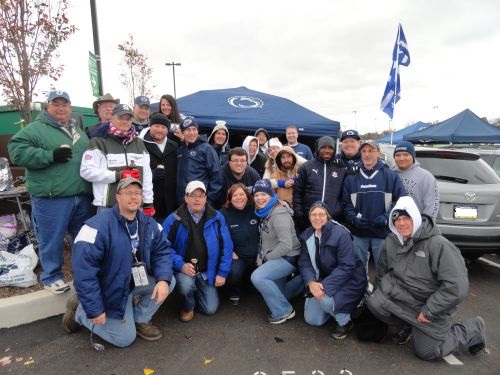 Back at the tailgate, hungry tailgaters enjoyed ribs and beef soup. Chad warmed up the deep fry and we used the new fry cutter to make fries for poutine. We also cooked pierogies, mac and cheese wedges cheese sticks and sweet potato fries (from Larry's homegrown sweet potatoes). As the sun set, the group quicken thinned out. We were able to get a group picture before Chad headed to volleyball. Rob headed over to the RV lot to get Chalupa and bring the truck over. The wind stayed low and we sat around the fire place talking until around 10. We (as usual) were the last people in the lot. We wished each other a happy thanksgiving and then headed home. See everyone again in 2 weeks for MSU. SundayNormally, the pack up and ride home is pretty uneventful. This was not the case this Sunday. We passed Scott's wife Melissa and Scott's Mom on the way home. We had to stop when Chad lost a bumper cap and a piece of PVC began sliding out. We also had to make an emergency stop for fuel in West Middlesex with only 3 miles to empty.For the Glory, Dirty Alumni Tailgating Newsletter Volume XI Issue 9 Maryland11-01-2014![]() FridayLeft 1730 hrs. Friday. Dinner at Clem's BBQ around 7pm. Staff was dressed in Halloween costumes, and we overheard them describing their plans for the evening. The one guy working there said he planned to get drunk and pass out in the woods. We were wondering what you think is normal if your plans are to pass out in the woods.We drove out of the rain as we got into Altoona, and we continued on to meet Mad and Suz to drop off some of the tailgating supplies around 2100 hrs. Rob and Chad checked out the excavation work being done at Mad's mom's house for the new addition. Once unloading and visiting briefly, we continued to the RV lot where we found ourselves at the extreme east end of the overnight RV lot. The lot was surprisingly full compared to what we expected, but we were pleased to have a nearly perfectly level spot that made unhitching the truck not necessary, thereby reducing our setup time considerably.