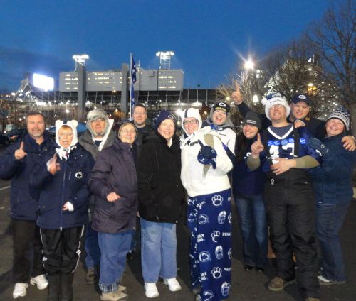After parking and socializing with Jeremy and Heather, we headed into town for dinner. We spot at 409 win(g)s for some lackluster wings and fries. There were some people downtown, but overall, it was pretty sparse. Once back at Jeremy's place, we watched Planes, Trains and Automobiles before heading to bed for the evening. SaturdayOvernight, another inch of snow fell in State College. Mad and Suz were able to get into their parking spot. While waiting for a cab, I borrowed a sled and went sled riding in Jeremy's front yard. We caught a cab up to BJC. As we were walking in, we caught up with Larry and Carol. The Greene's also had a unique experience walking across an almost empty campus. When we arrived, the tailgate was set up but the remainder of the lot was nearly empty. I turned on the fireplace. Mad and suz heated up sausage pancake bites and sausage pastry puffs for breakfast. Carol's singing PSU Christmas hat keep us entertained during the morning. This tailgate's theme was Beer, Chocolate, Steak (BCS). We had a cool full of porters, stouts and labics to enjoy. I passed out samples to people, so we could all enjoy the selection. Due to the parking policy changes, the snow covered grass lot was empty. Mad, Michelle, Elizabeth, Todd and I walked the sled over to the far side of the lot near University Drive and took turns sledding down the hill. Everyone had a good time and Maddy went the furthest. Cari's friends Gary and Zakiya joined us with a special chair with coolers in both arms. For lunch, we had corn and kielbasa soup, and Steak kabobs, with onions, peppers and pineapple. Our group photo was taken with the sled in the photo. Dena, Mark and their boys Sean and Matt joined us before game time. MSU returned the opening kickoff for a touchdown, which marked the beginning of the end for us. Only 99,902 fans were in attendance for this cold and dark game. Penn State was making yardage, but seemed to hit a brick wall at field goal range. The Spartan took advantage and put us out of our misery with a final score of 34-10.