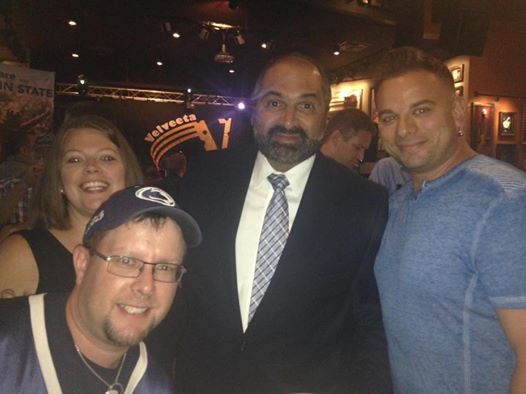 We exited the lock and very slowly overtook the Pamela Ann in the Sewickley Pool on the way to Emsworth Lock and Dam. I radioed the lockmaster and we had no wait getting into the lock. As we were tying up to the lock wall, there were a few sprinkles of rain, but it didn’t last. The guys at the lock were asking us about the game, since I had a Penn State flag hanging from the rear roof strut. Now in the Pittsburgh pool, we ate some ham and turkey sandwiches. We stopped at Peggy’s Harbor and attempted to get some fuel. Peggy wasn’t open and rather than just open and sell us some fuel, she came out to tell us that she was closed and that dogs aren’t allowed. Mad and Suz were walking the dog and were told to “leave the way we came in.” I didn’t see any signs that said no dogs. Peggy is a jerk and I won’t stop there again. That was our last stop before rounding the bend and seeing the Point at Pittsburgh. I pointed out to our Philly friends where we would be tailgating tomorrow. By this point in the trip, Suzanne really liked the boating life and may be thinking about getting a boat of her own. We stopped at Washington Landing for fuel and they were much better. A dockhand helped us to tie up and showed me what I needed to do to fuel up. From there, it was a short trip to tie up at Millvale Marina. We did get a heavy rain for a few minutes while we were buttoning up the boat for tomorrow. I drove Chad back to our home marina and Maddy, Suz and I went home to meet Shawn, Shari, Cari and Jessi had arrived during our aquatic travels. I had to drop off Chalupa with my mom since we wouldn’t be home to let him out tomorrow and he couldn’t stay on the boat while we were in the game. The sailors got cleaned up and we all headed to the Alumni mixer at Hardrock Café. Cari had purchased tickets for this private event weeks before. There was food everywhere when we arrived. We got a picture with Franco and got to listen to Velveeta before it was time to head home due to our early start.